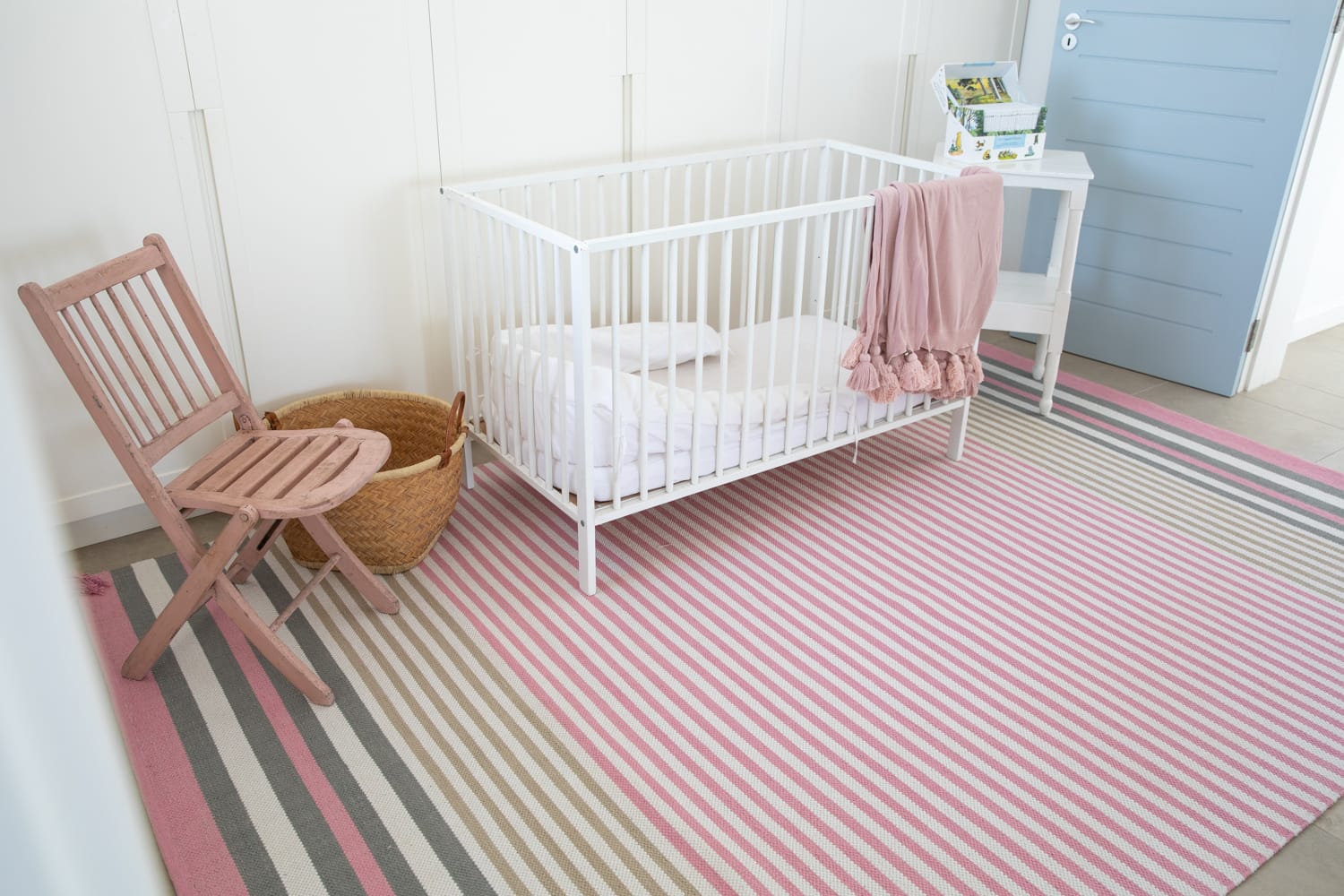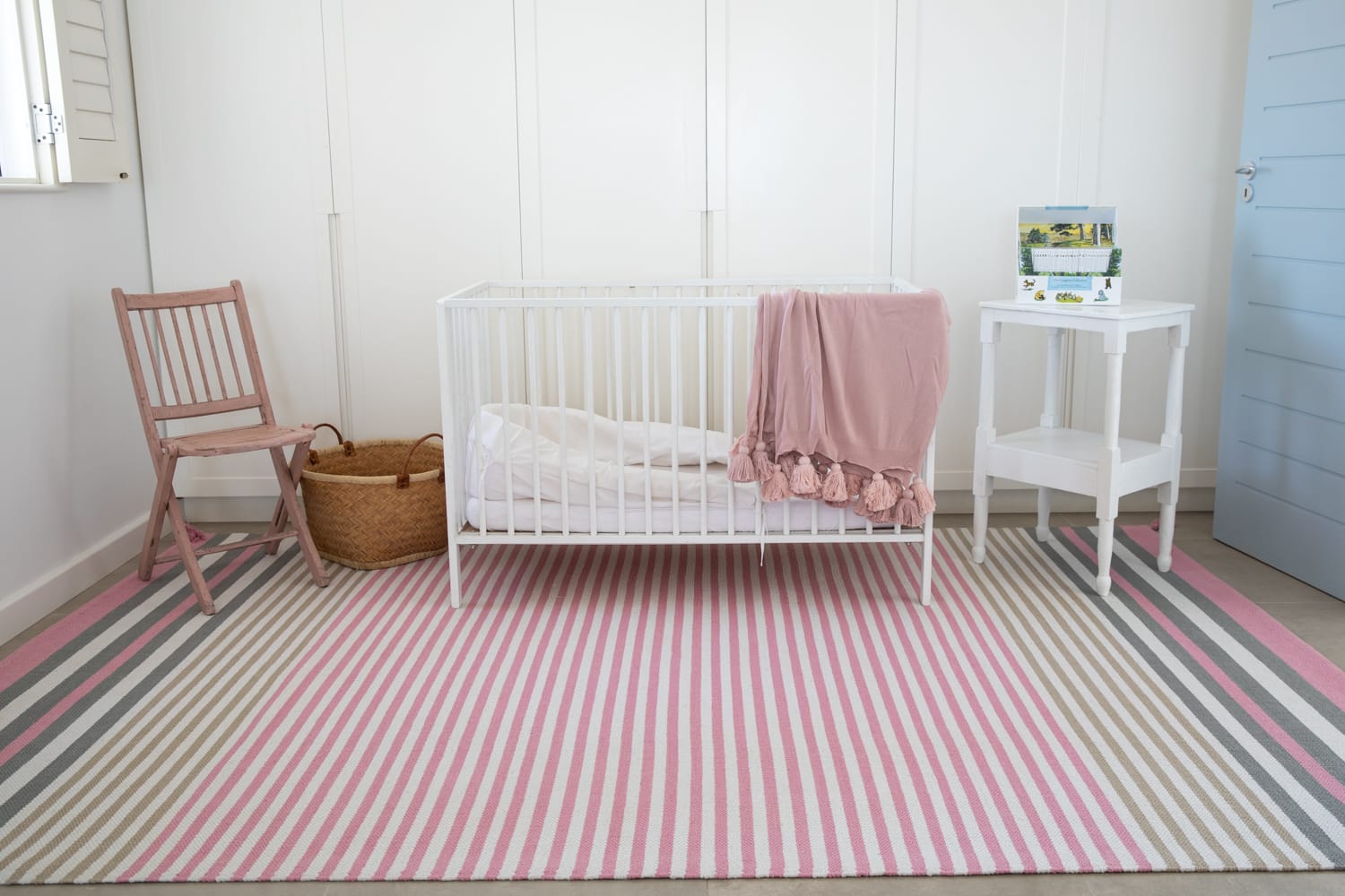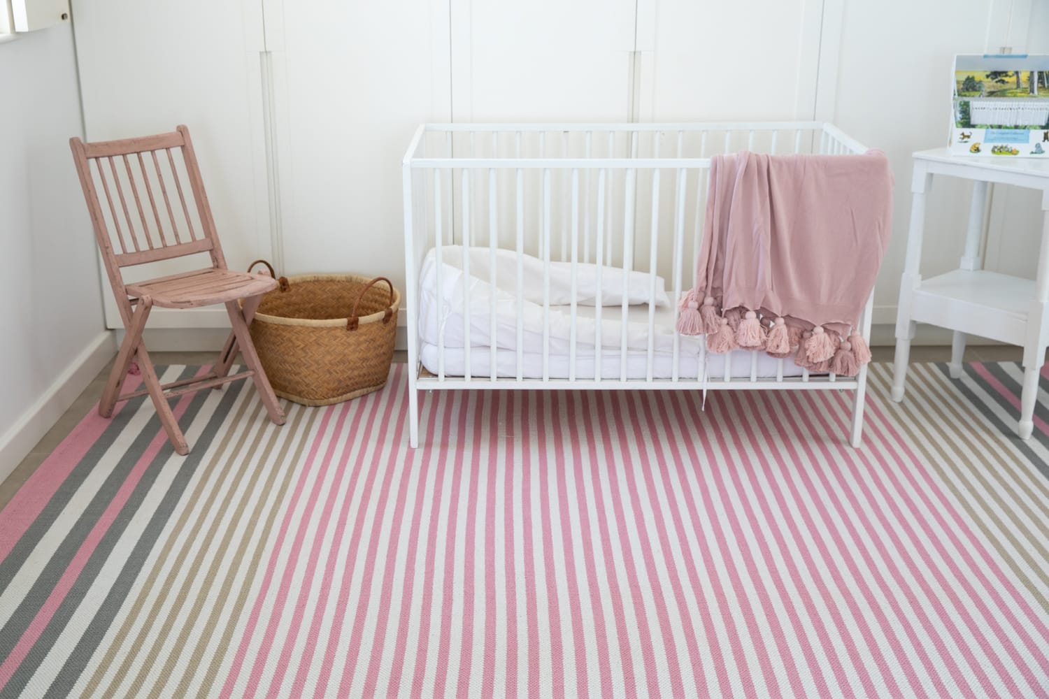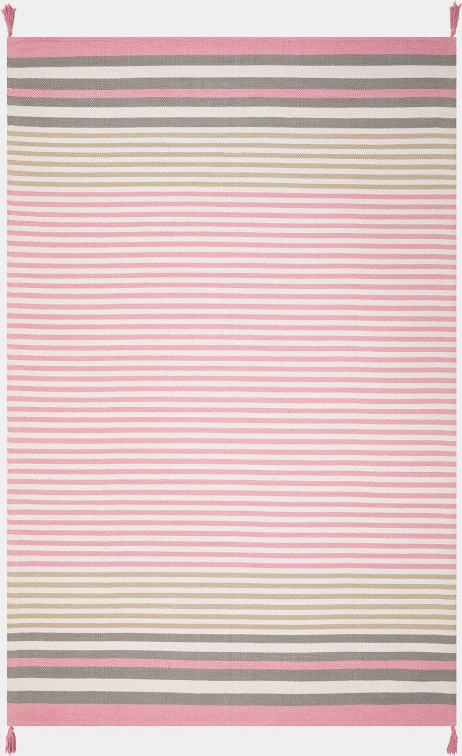 Handcrafted in India and characterised by a balanced palette of striking pink and neutral hues, this rug was designed to brighten a range of spaces, including bedrooms, playrooms, and dining rooms.