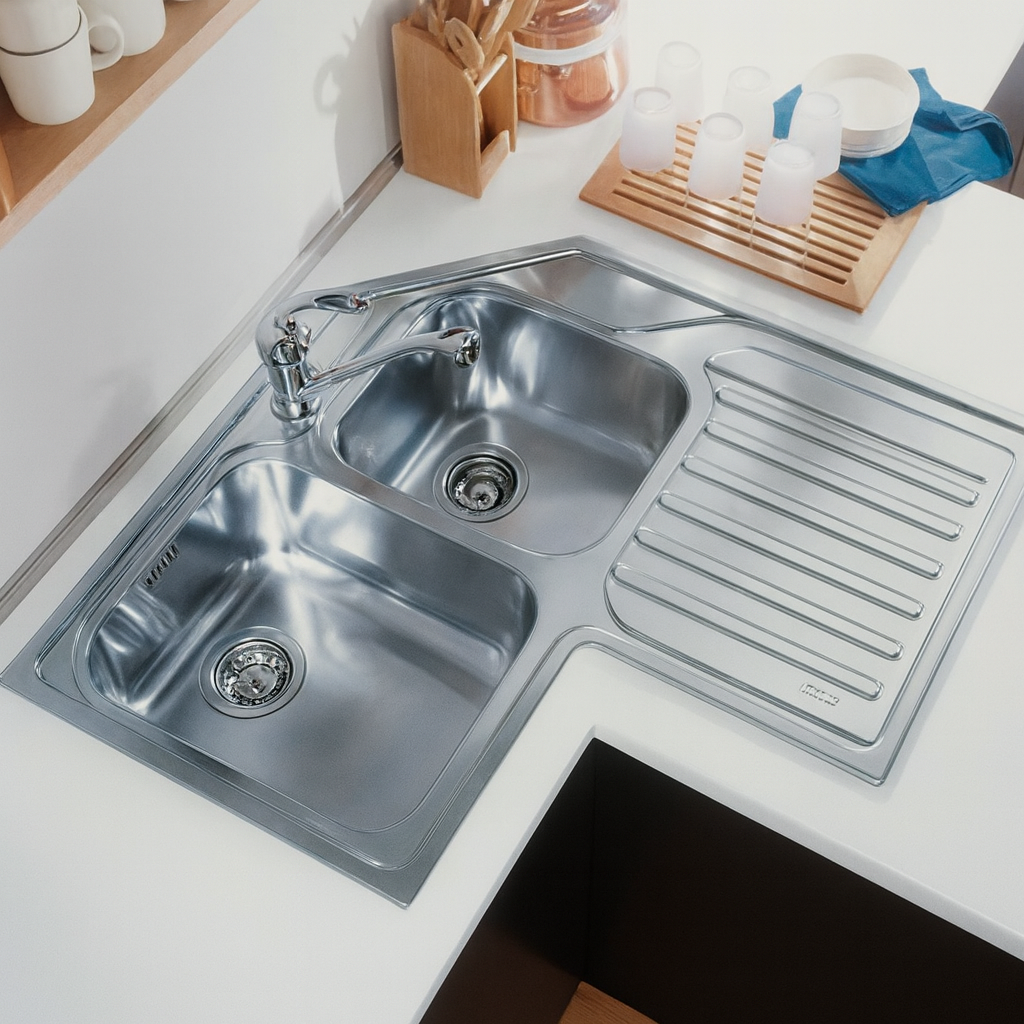 The Cumbre CNR DBL Bowl sink features a precise balance of geometric shapes, emphasizing order and symmetry for a refined, functional kitchen space. Crafted from durable stainless steel, this built-in sink includes two angular bowls and an integrated drainer, offering practical versatility. With dimensions of 830 mm by 830 mm and a height of 160 mm, it fits seamlessly into your countertop, combining elegance with everyday utility.