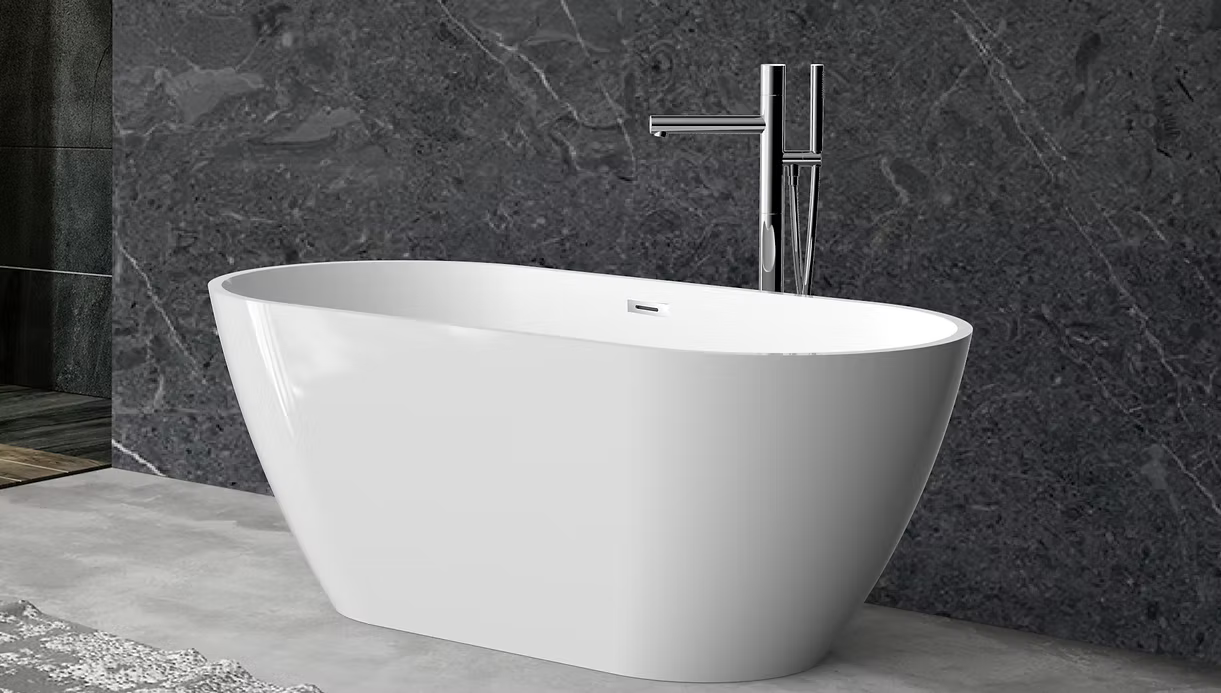 Freestanding Bathtub - high grade acrylic (reinforced with resin and fibreglass) Includes built in chrome overflow, chrome pop-up waste, trap and stainless steel frame with adjustable legs