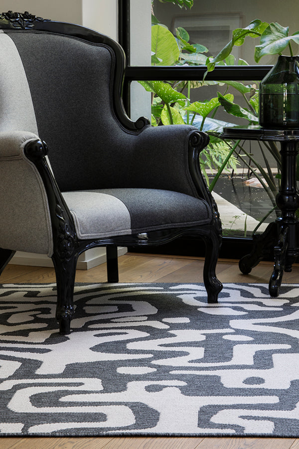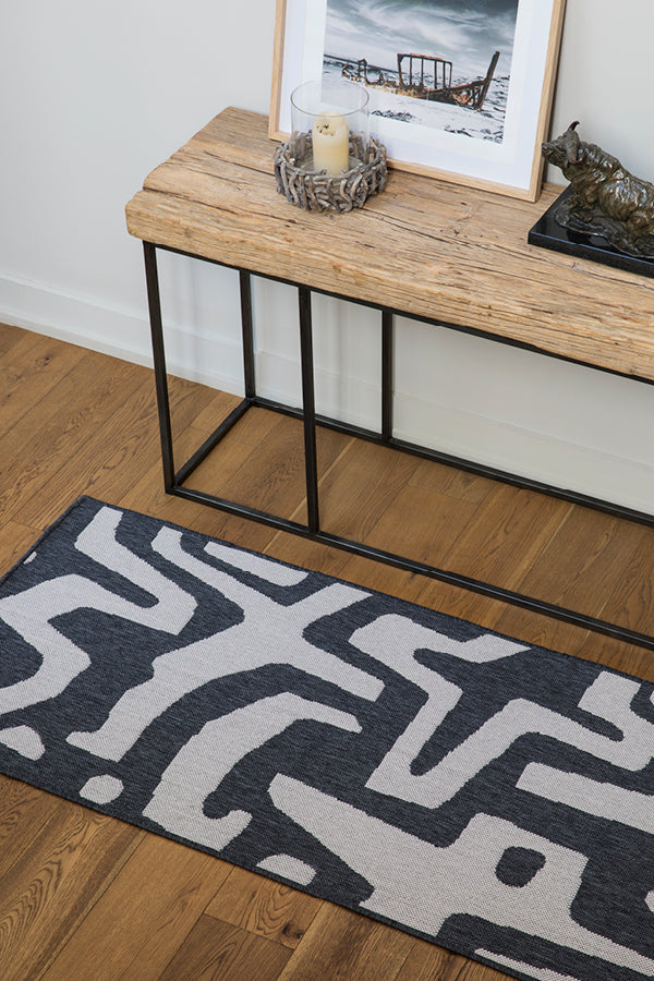 A Rug using the abstract shapes found in raffia cloths woven traditionally for ancient warriors and kings.