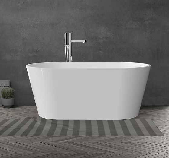 Freestanding Bathtub - high grade acrylic (reinforced with resin and fibreglass) Includes built in chrome overflow, chrome pop-up waste, trap and stainless steel frame with adjustable legs