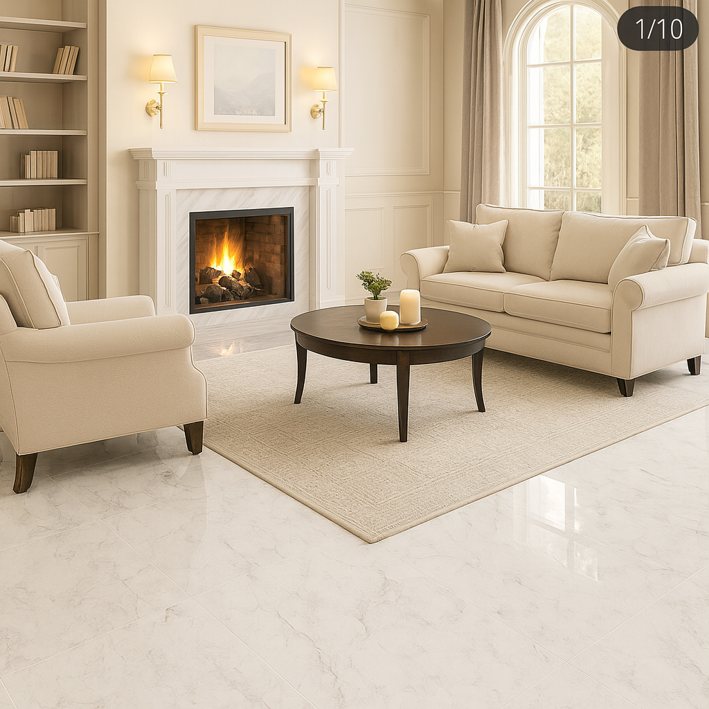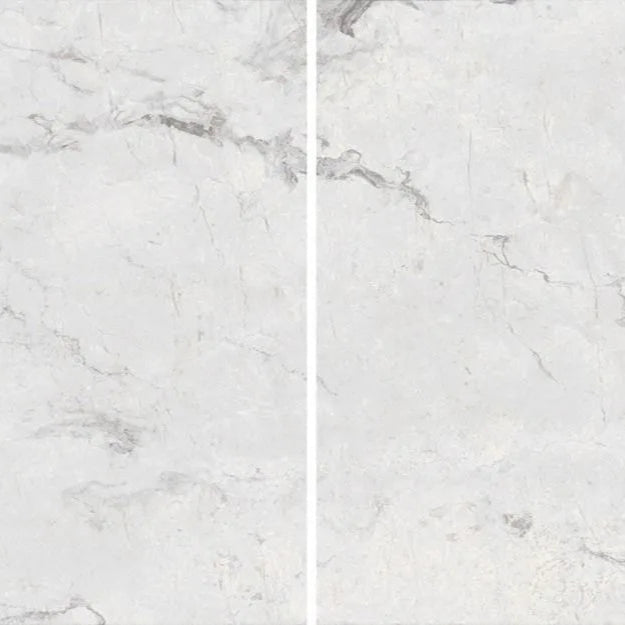 These Roman Silver stoneware porcelain tiles measure 600x1200mm and feature a refined white glaze with high-definition digital print on all four edges. Each box contains three pieces covering 2.16 square meters and weighs 46.5 kg, making it suitable for durable, sophisticated installations. Ideal for creating elegant and lasting surfaces in both residential and commercial settings.